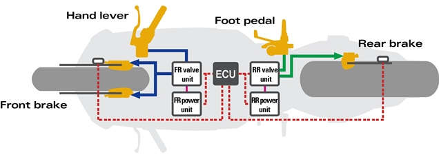 Honda announced world's first electronically-controlled “Combined ABS” for super sport bikes.The system consists of an electronically controlled combined “brake by wire” system, with an innovative stroke simulator. Direct motor control ensured precise operation of the ABS.