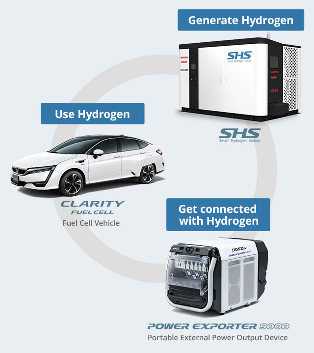 In its endeavor to realize the joy and freedom of movement and an enriched sustainable society, Honda has on the one hand been developing fuel cell vehicles (FCVs), and on the other, has pursued its own research and development of hydrogen stations that efficiently generate hydrogen from renewable energy, as a low-carbon technology to "generate" hydrogen for "use" by FCVs.