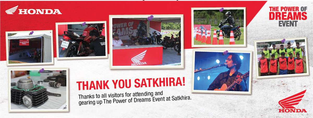 Bangladesh Honda Private Limited (BHL) arranged a grand event named “The Power of Dreams” in Satkhira. This event hold in 14th and 15th July 2017 in Satkhira Zilla stadium. It was a two days event where Honda showcased Honda’s glorious history, displayed all products, arranged test drive activity, exiciting game show, Free service and a concert by renowned singer Bappa Majumder and his band Dolchut. In this mesmerizing Event, Honda grabbed massive attention from the visitors by showcasing the Honda motorcycles and free servicing facility. The unique decoration of the event has also been praised by all.