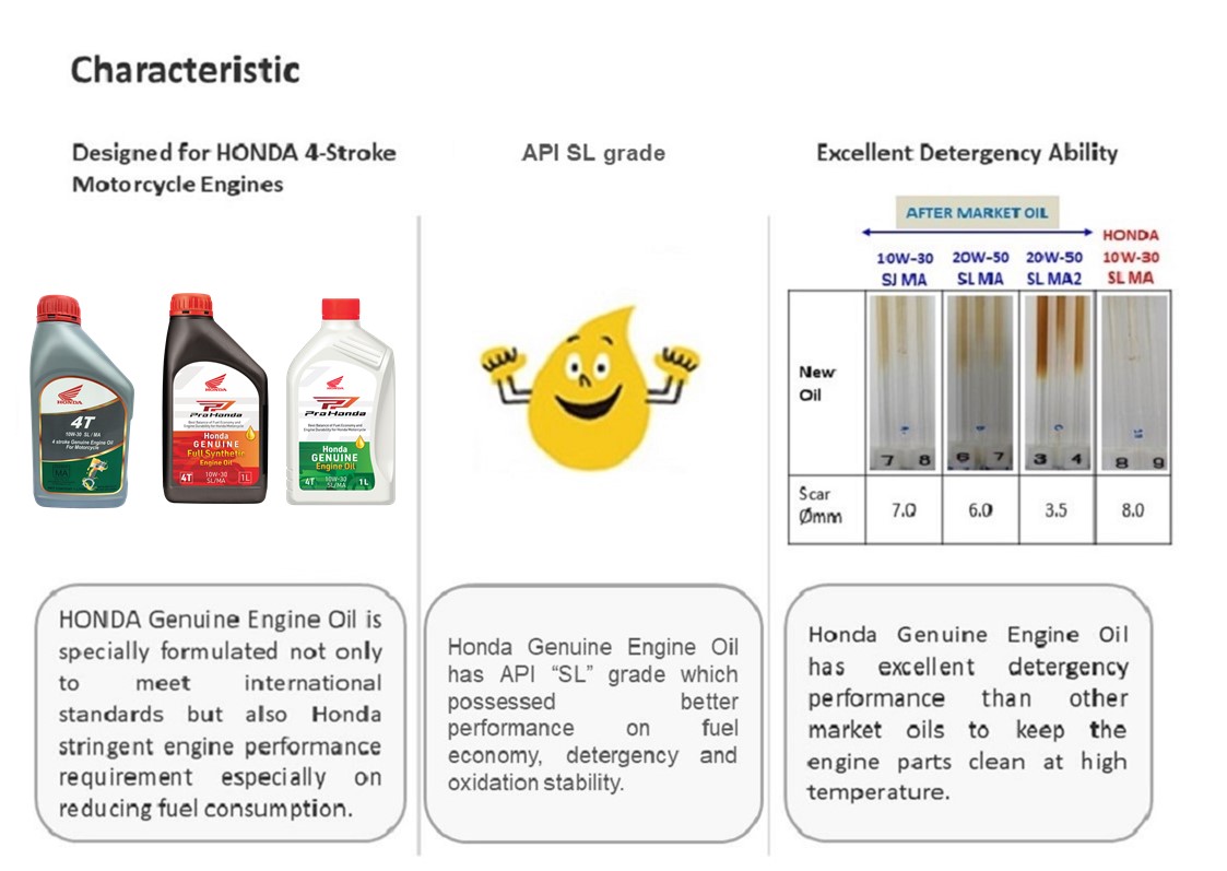 Honda 4 Stroke Engine Oils are premium quality engine oils Tested by Honda R&D (Japan). They conform to international specifications of JASO (Japanese Automobile Standard Organization) MA. Honda 4 Stroke Engine Oils have been developed keeping in mind the difficult driving conditions prevalent on Bangladesh roads. To meet the complete lubrication needs of your Honda Motorcycles we strongly recommend that you use Honda 4 Stroke Engine Oils only. Test evaluation of Honda 4 Stroke Engine Oil indicates the clear benefits of this oil over conventional 4T Oils.